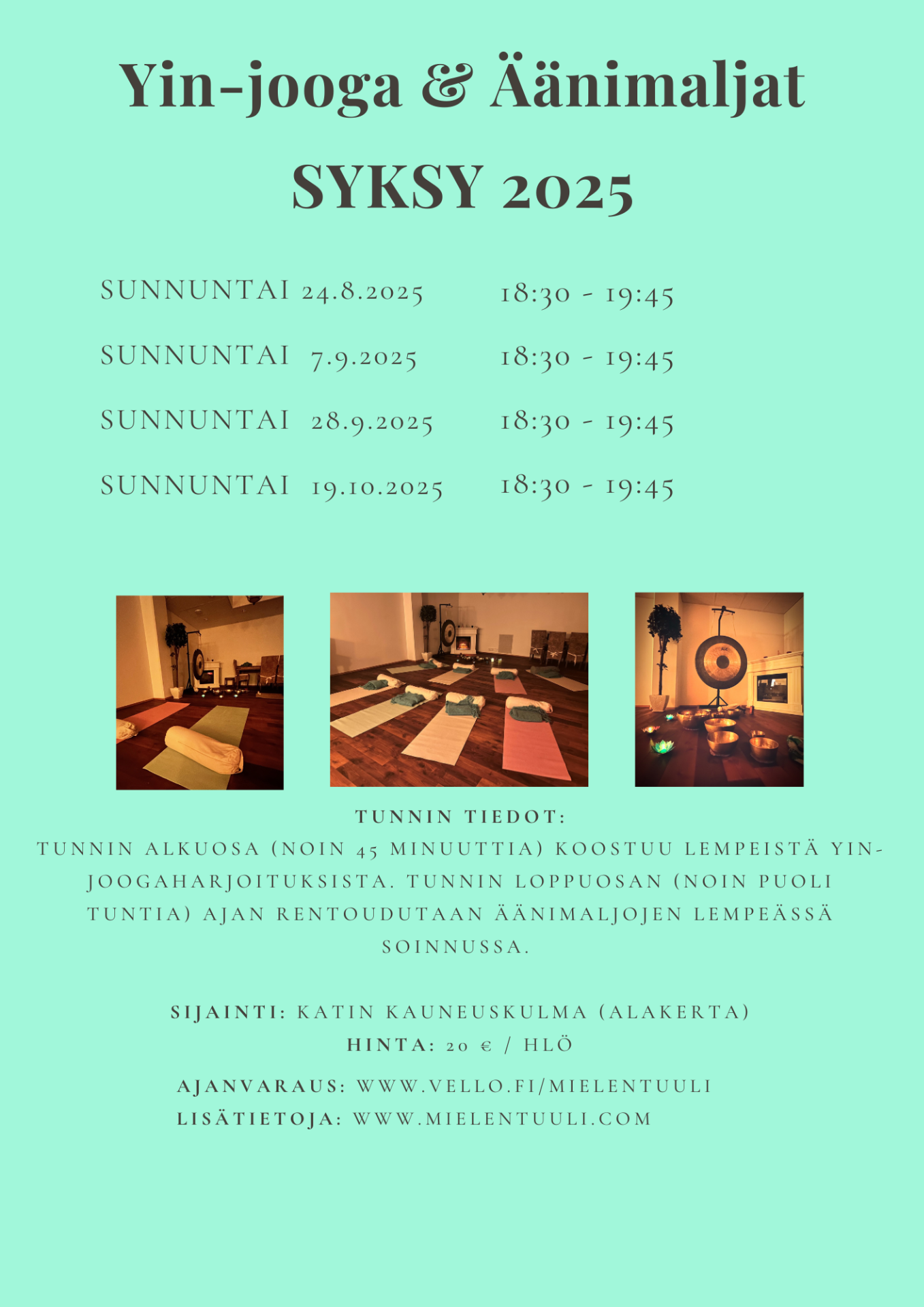 Syyskauden 2025 (elokuu-lokakuu) Yin-jooga & Äänimaljat-tunnit Korsossa (Katin Kauneuskulman alakerta) ovat nyt varattavissa!